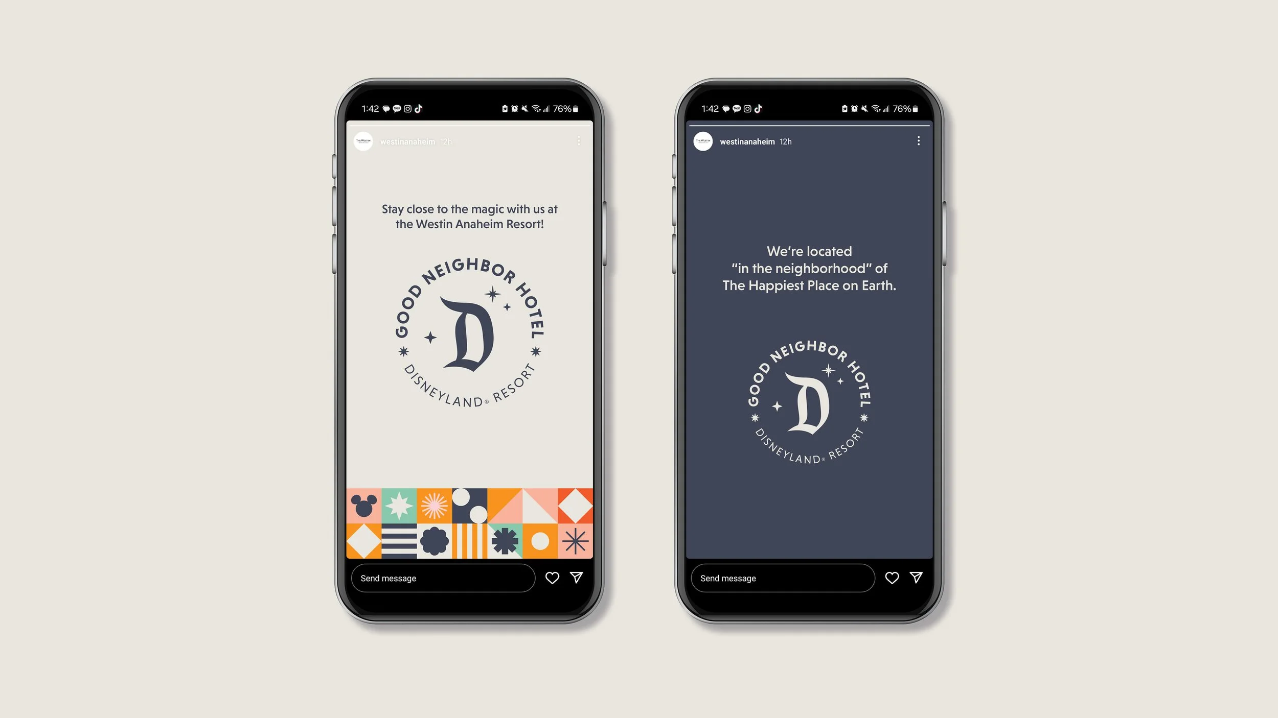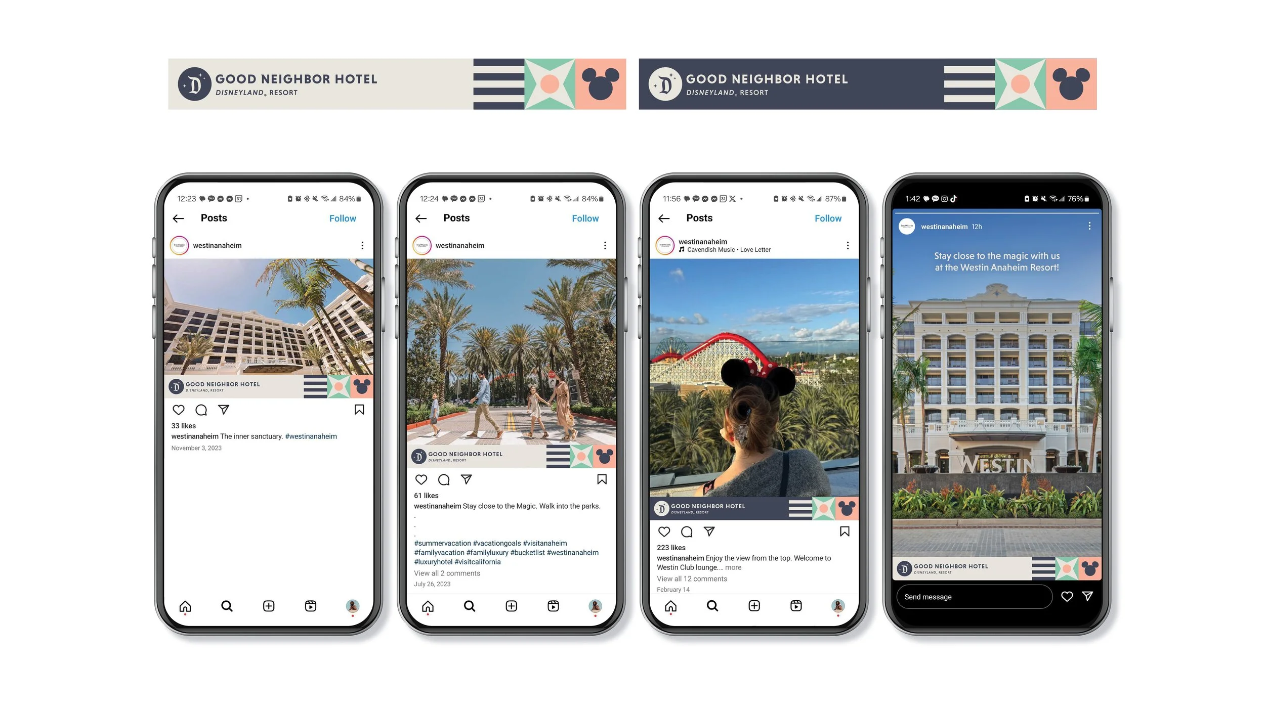 I also designed a system the hotels can use for specifically their photography-based social posts to convey that they are a Good Neighbor Hotel. These iterations feature actual posts that have been posted by one of our Good Neighbor Hotels. No matter what size the post is, the “bar” is intentionally placed at the bottom not only as a locator, but also as the most balanced way for each Hotel’s separate brand to have its own chance to shine in partnership with Disney. It also includes a hint of the brand pattern, including Mickey Mouse, to tie it closer to Disney and the Good Neighbor Hotel brand.