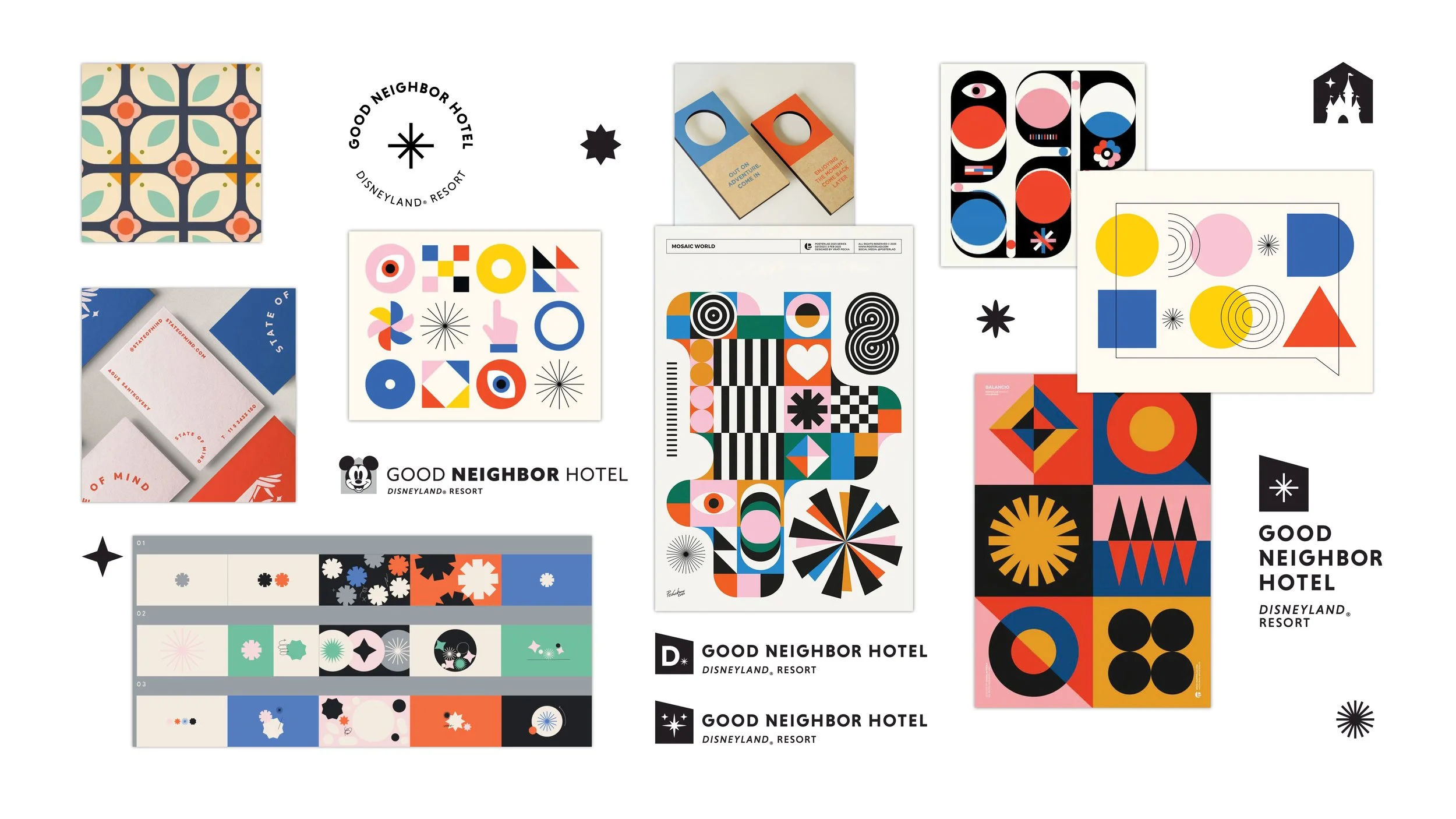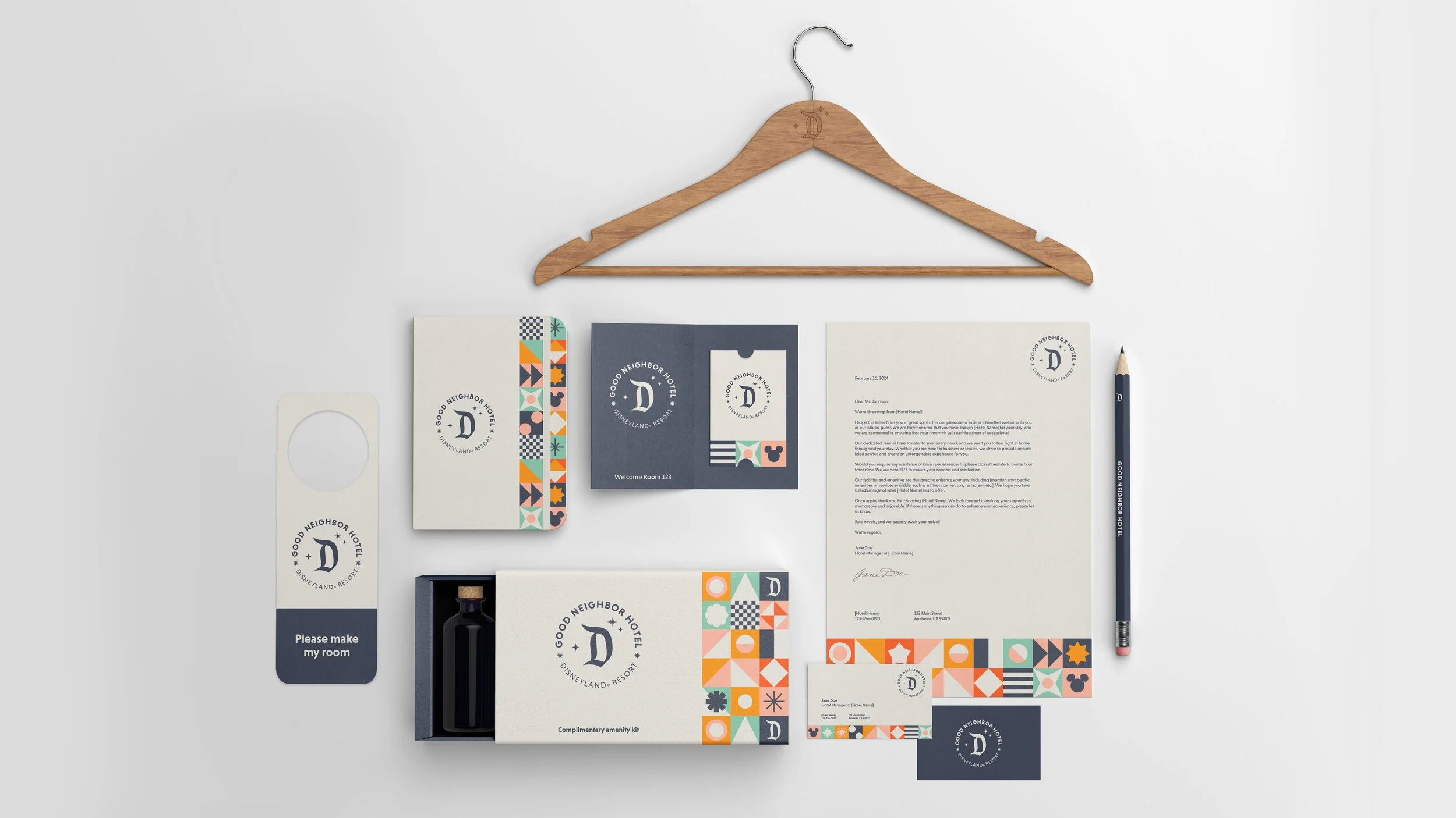 Being that this rebrand is specific to our Good Neighbor Hotels in California, I took inspiration from California’s extensive hotel history that has mid-century modern influences. Disney has its own extensive mid-century modern history, so something like this direction fits well into the Disney brand, combining the charm of a Californian stay with the magic that only Disney can provide.