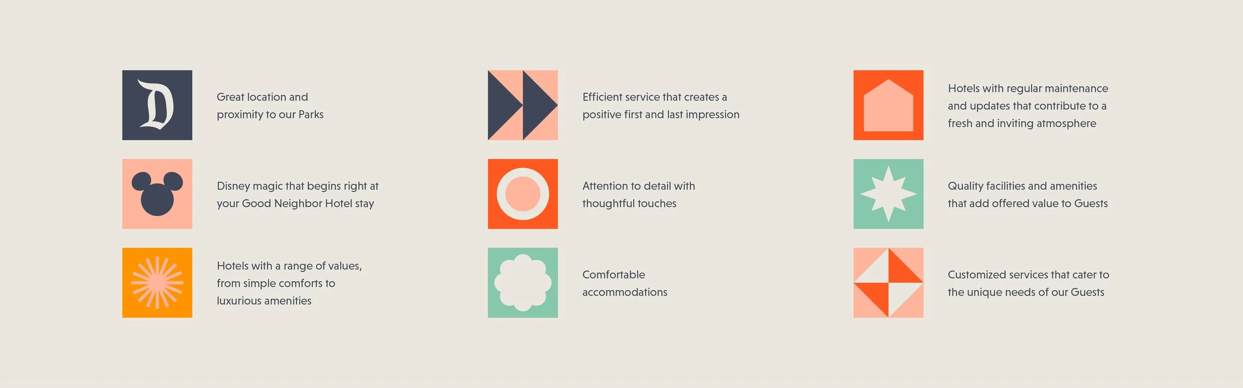 As I was thinking of the branding, I began thinking of these pillars that represent what makes a Good Neighbor Hotel a great stay. And in representing each of these, I created an abstract visual language that formed the graphic approach for the brand.