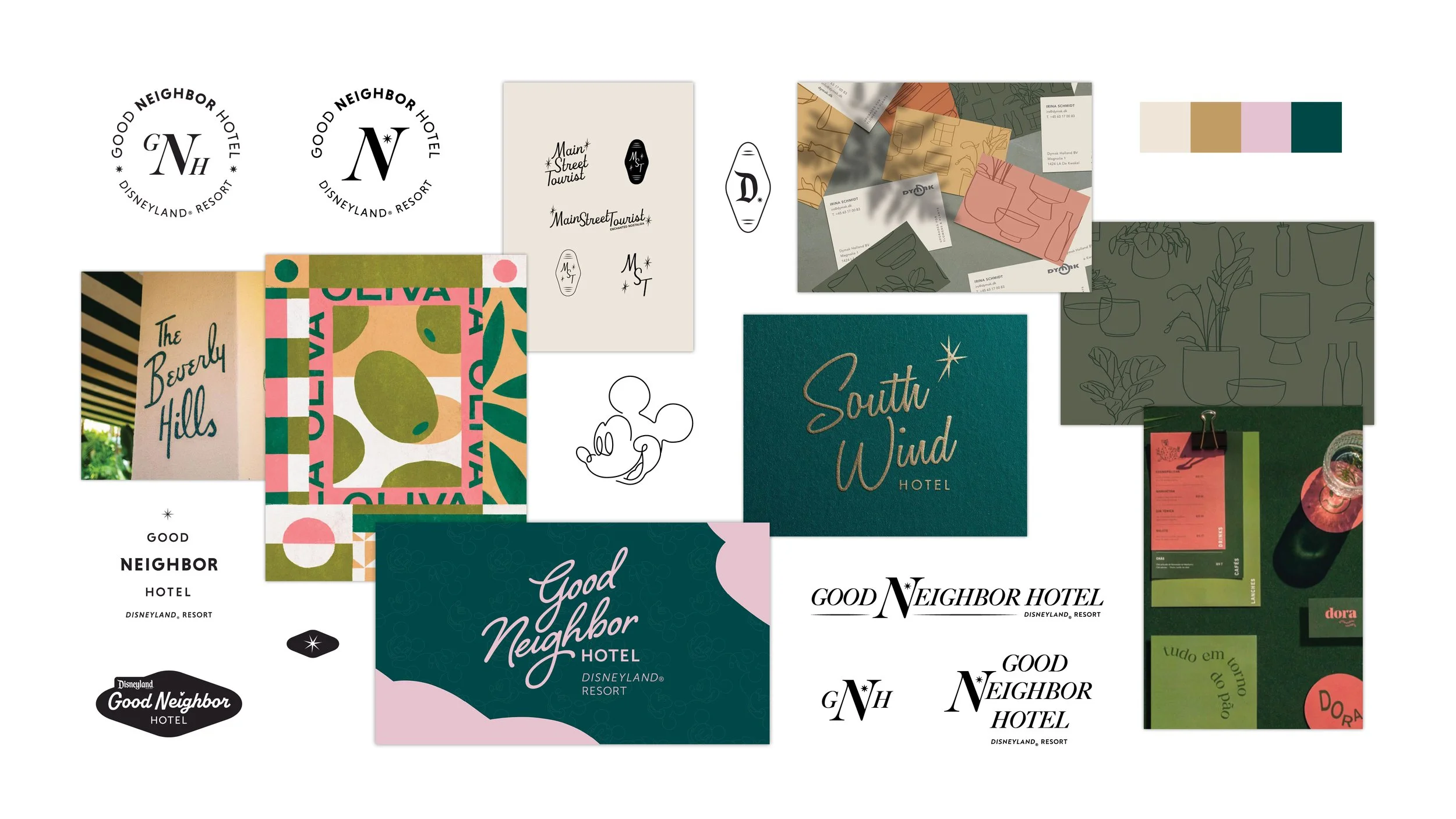The color palette takes inspiration from The Beverly Hills hotel while being open enough to be applied to our many Good Neighbor Hotels that span a variety of value. I had also envisioned this brand direction living with an eclectic, organic Mickey Mouse pattern that would play off the script logo direction nicely.